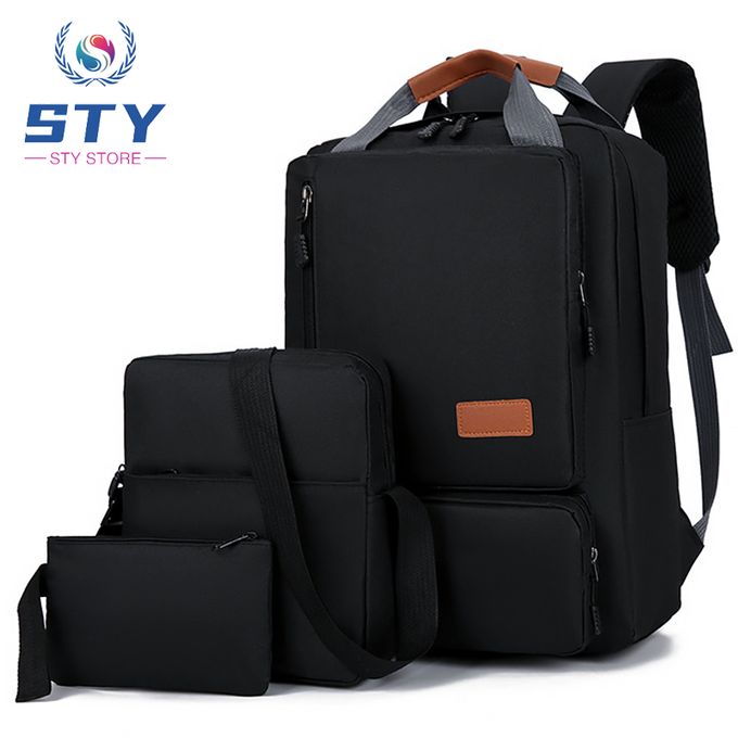 STY 3 In 1 Men Solid Color Laptop Backpack Bag Cross-body Bag Small Bag Set - Black